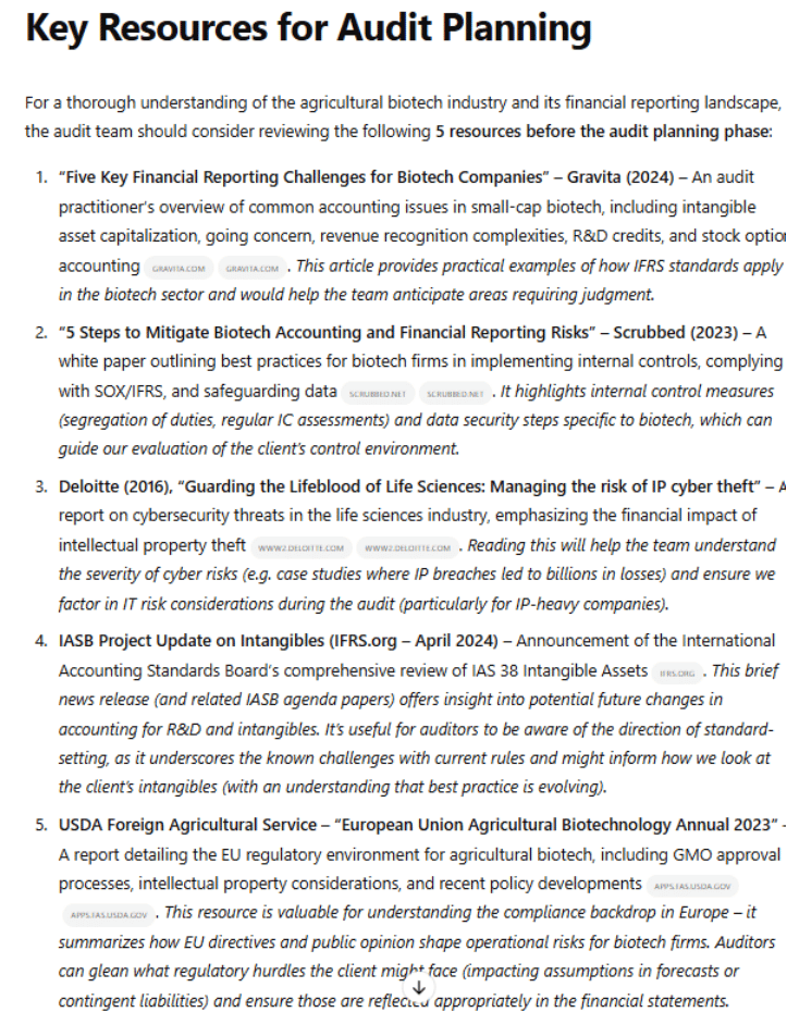 Below are three screenshots illustrating parts of the in-depth output from ChatGPT’s deep research function, showing how it provides organized data, detailed sector insights, and quick understanding for your audit planning.
