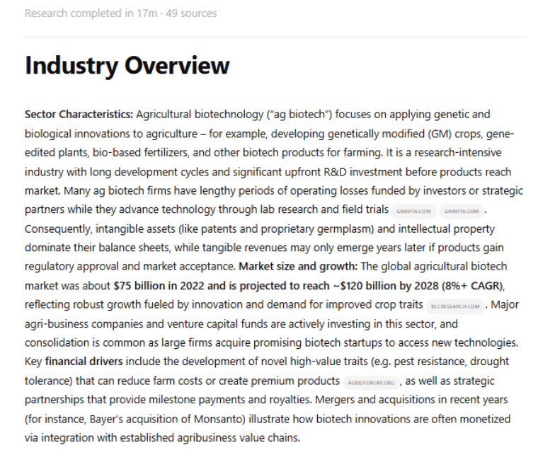 Below is the complete prompt we used to get a comprehensive “crash course” on the Agricultural Biotech sector for an audit team that had to perform an initial audit in a sector that was completely new to them. This is a prompt for Deep Research in ChatGPT from OpenAI.